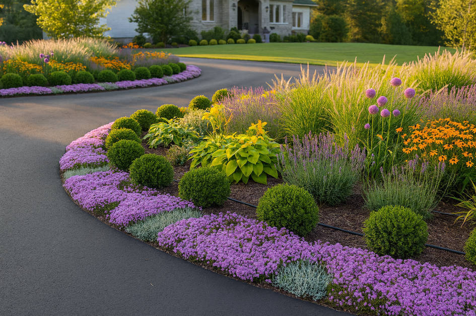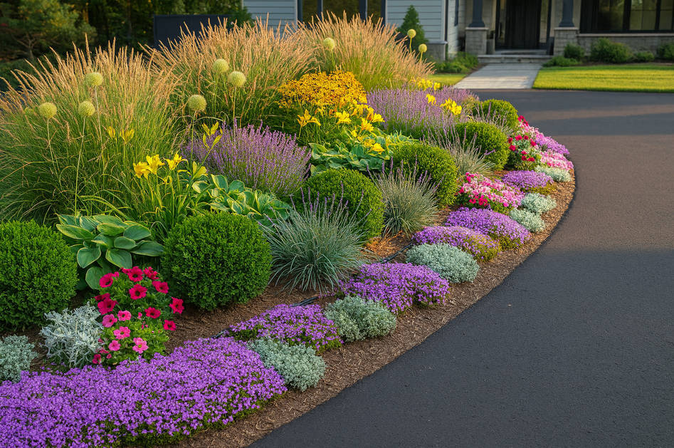 Tuck a few quick-change annuals, petunias, calibrachoa, or dusty miller, into open pockets for instant splash while perennials root in. Mulch with fine bark to lock moisture, then run drip tubing under foliage so watering stays hands-off. The result: a layered, drought-tough border that cuts mowing time, feeds pollinators, and frames the driveway with living color all year.