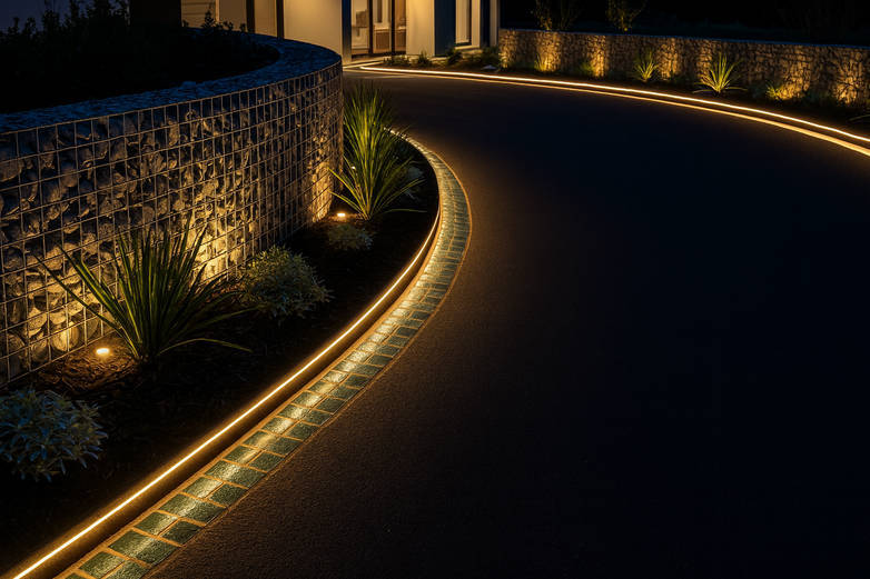 - Lighting integration: Slip low-voltage tape lights into gabion cavities, tuck puck lights under concrete capstones, or recess mini LEDs along a timber edge. Subtle illumination guides night-time parking, highlights texture, and adds a gentle glow without cluttering the sightline with extra fixtures.